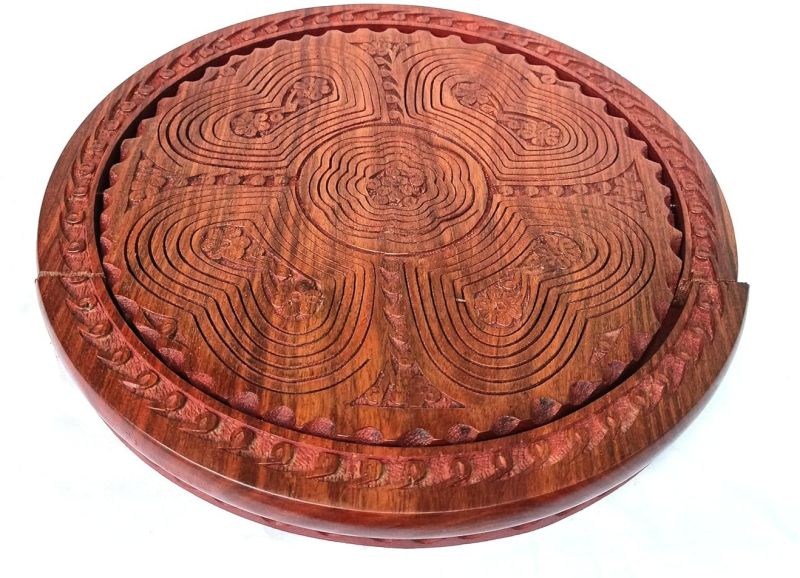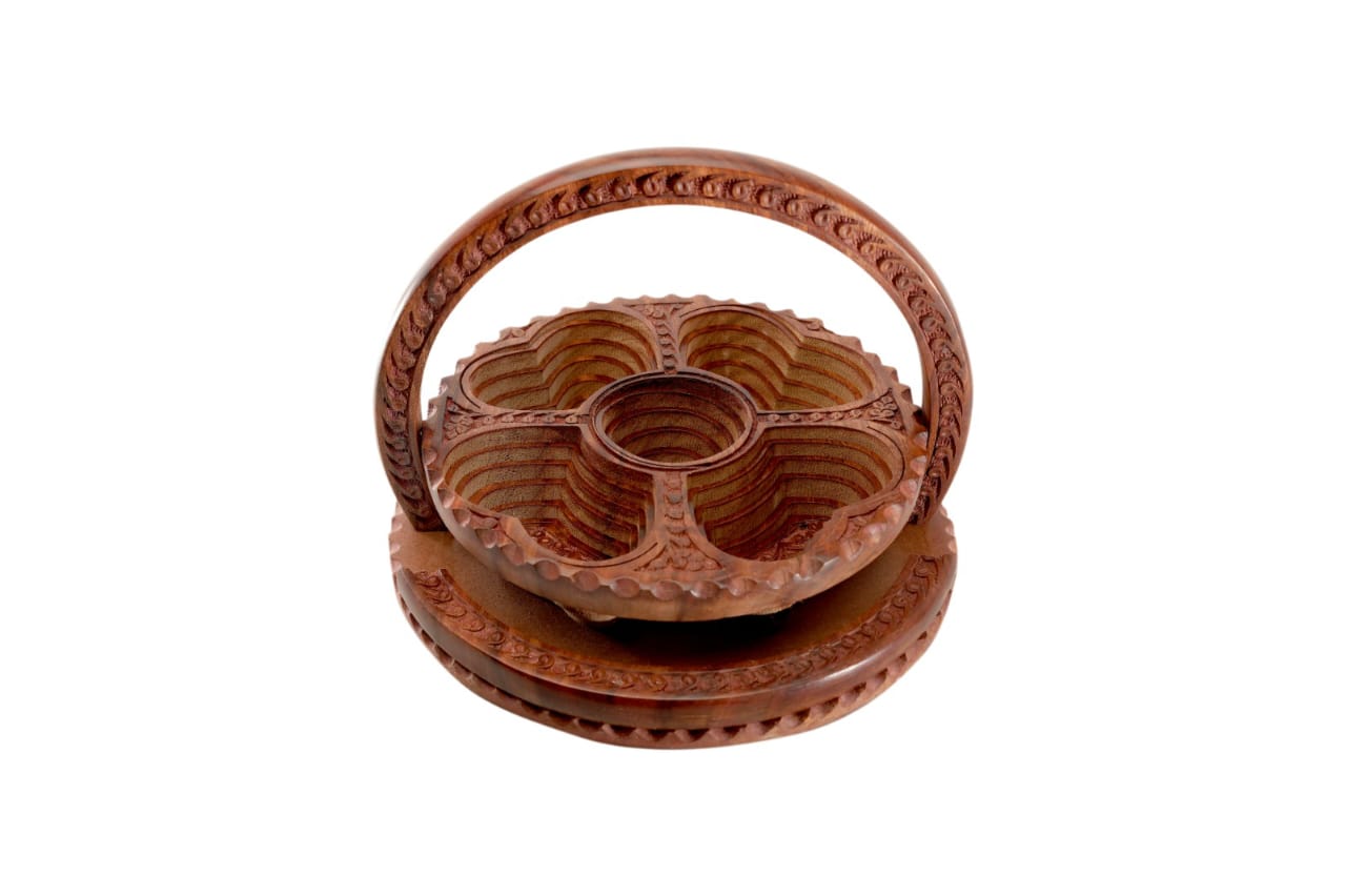 Gaylord’s wood carver 12 inch hand made foldable basket for dry fruits and Pooja items with 5 containers and round shaped handle